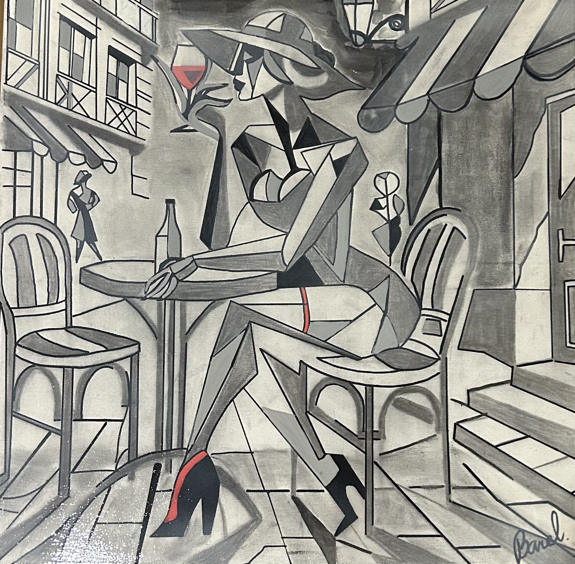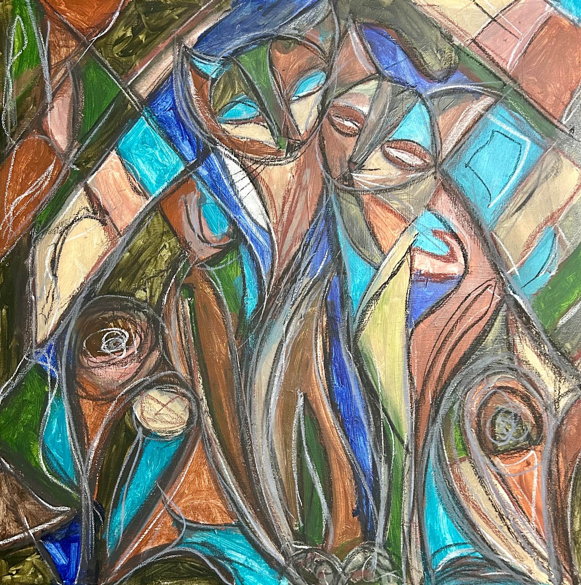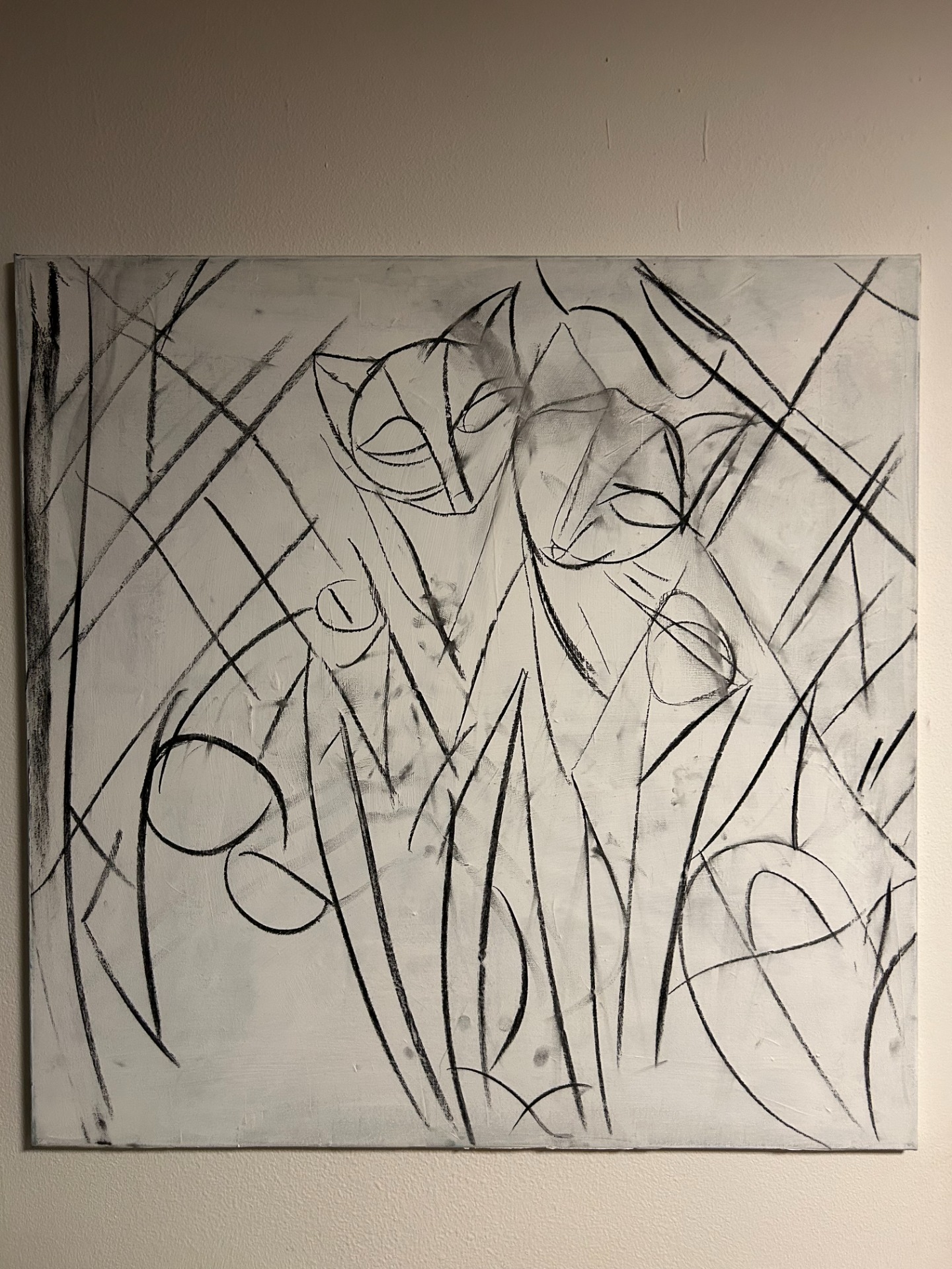 Návrh obrazu koček/lidí, v při tulení, sdílení okamžiku, v mém oblíbeném kubisticko/abstraktním pojetí. (60x60 cm)