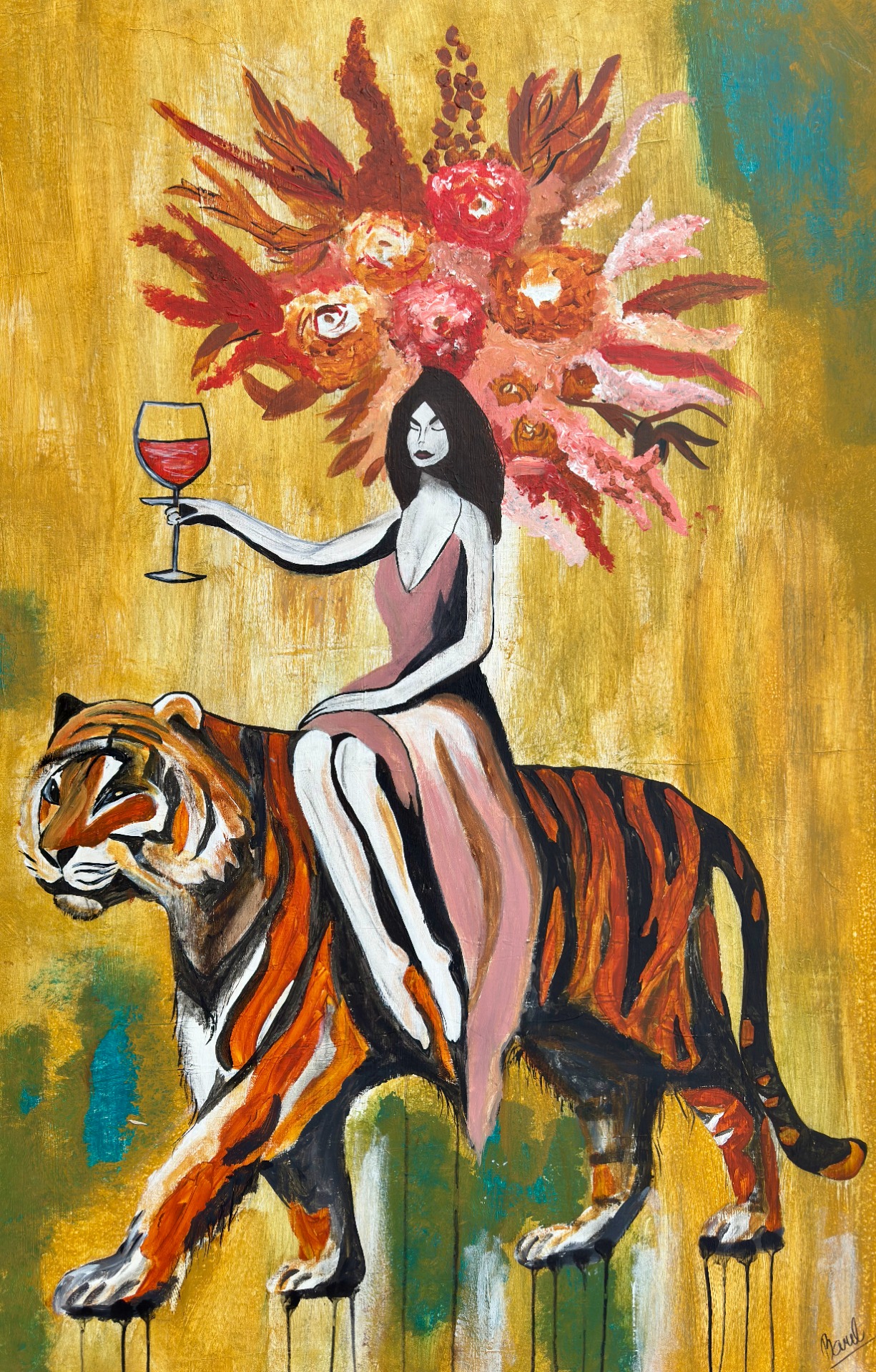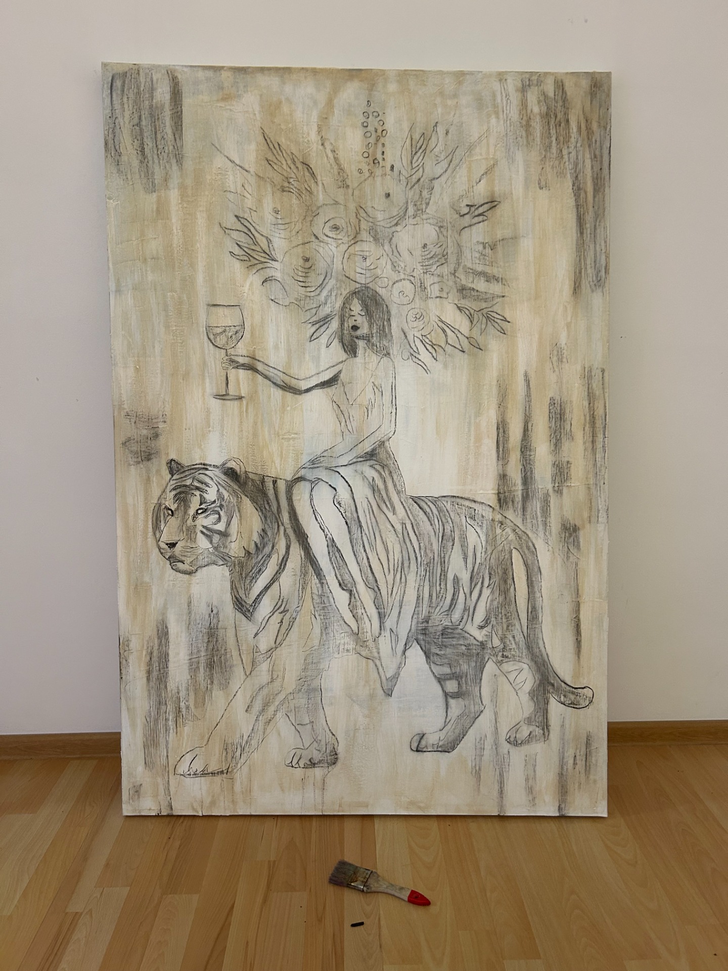Poslední do série, "Dáma na tygrovi", opět v návrhu. Tentokrát ve stylu snového surrealismu a abstrakce. (150x100 cm)