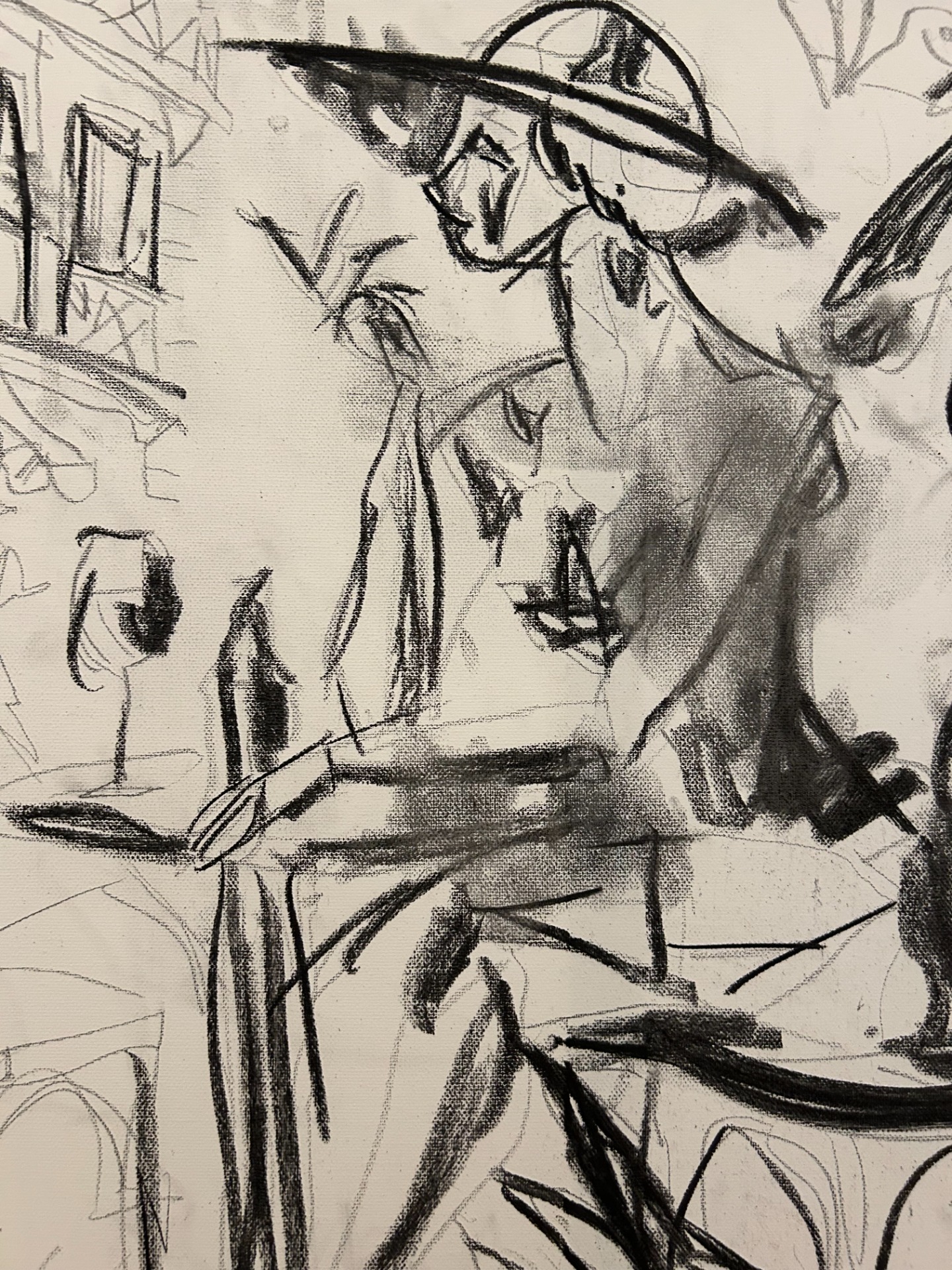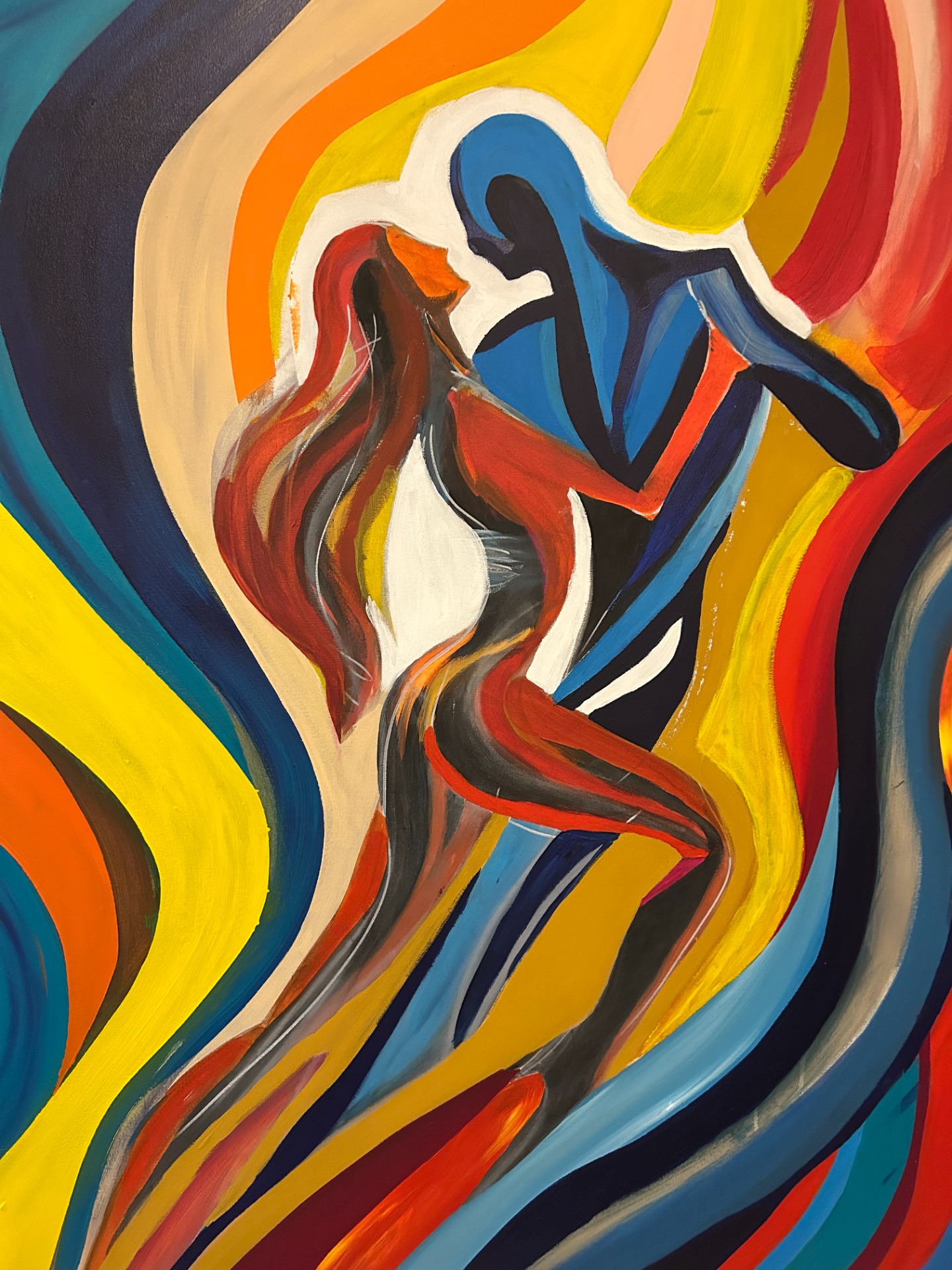 Tanečníci...blížíme se do finále, ale ještě zdaleka neodpovídá mé finální představě. Ovšem zachycení pohybu, vyjádřeného křivkami tam cítím, to je cílem. (150x100 cm)